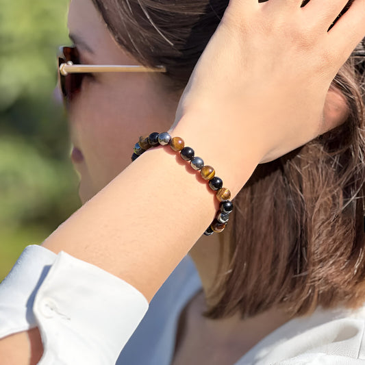 Schutzarmband “Dreifache Kraft“ mit Hämatit, Tigerauge und Obsidian