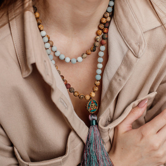 Gebetskette mit Aum-Mala-Perlen – Amazonit und Landschaftsjaspis